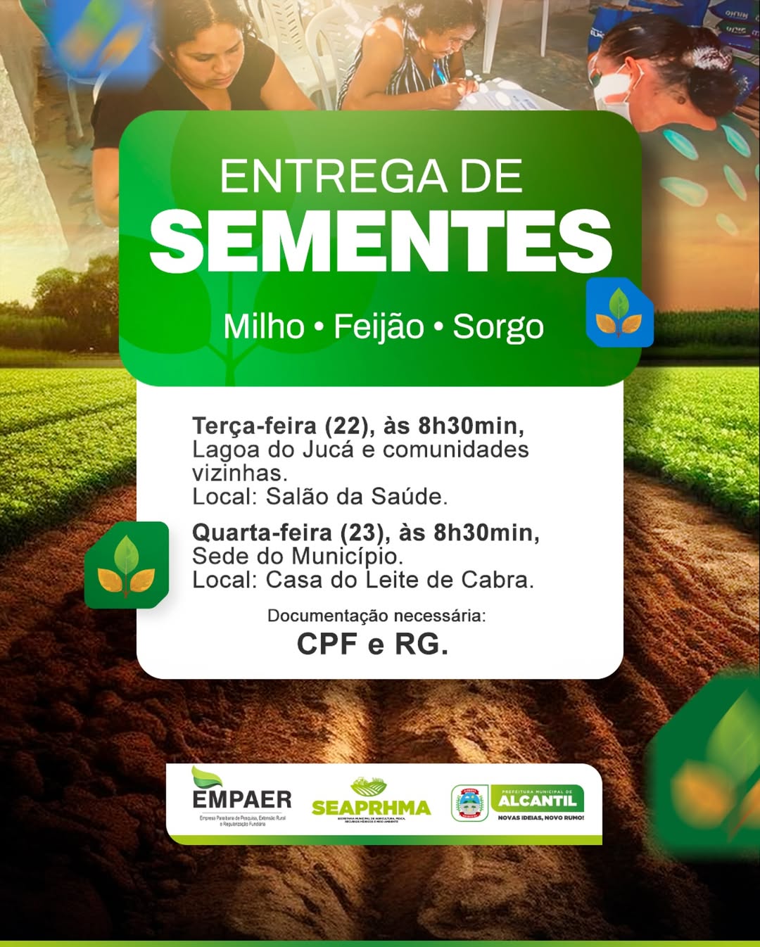 A Prefeitura de Alcantil, por meio da Secretaria Municipal de Agricultura, Pesca, Recursos Hídricos e Meio Ambiente, em parceria com o @govparaiba e a EMPAER-PB, vai realizar a entrega de sementes para os agricultores do nosso município