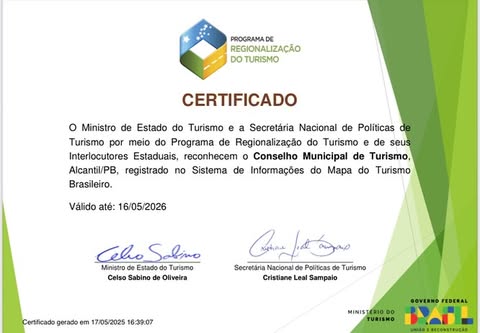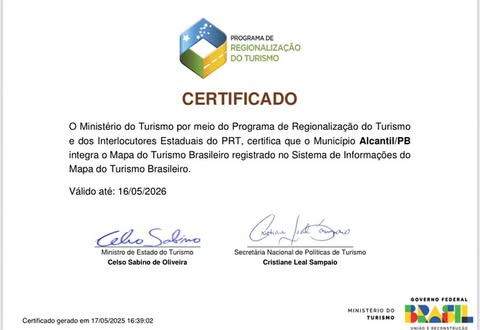 Já está disponível o certificado digital do município de Alcantil no Mapa do Turismo Brasileiro. O Ministério do Turismo (MTur) liberou a emissão do documento por meio do site. A Confederação Nacional de Municípios (CNM) lembra que a certificação é uma maneira de comprovar que o Ente municipal integra a lista dos destinos brasileiros que trabalham o Turismo como política de desenvolvimento econômico e geração de empregos e renda. Ou seja, uma forma de valorizar o trabalho da gestão local.