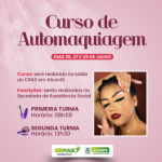 A Prefeitura de Alcantil em parceria com a Secretaria de Assistência Social realizará nos dias 25, 27 e 29 de julho um Curso de Automaquiagem. O curso será ministrado no CRAS – Alcantil e as inscrições devem ser realizadas na Secretaria de Assistência Social.